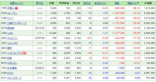 現物 信用 資産 77,129,086 (年初来10.0%) TOPIX 2,237.29 (年初来18.3%) 全期間 今年 個別ロング:294% 指数ショート:34% 実質エクスポージャー:260% TOPIXは2.9%下落に対して、入金・配当金抜き資産は14.6%下落。 TOPIX比で、今年33週のうち18勝13敗…